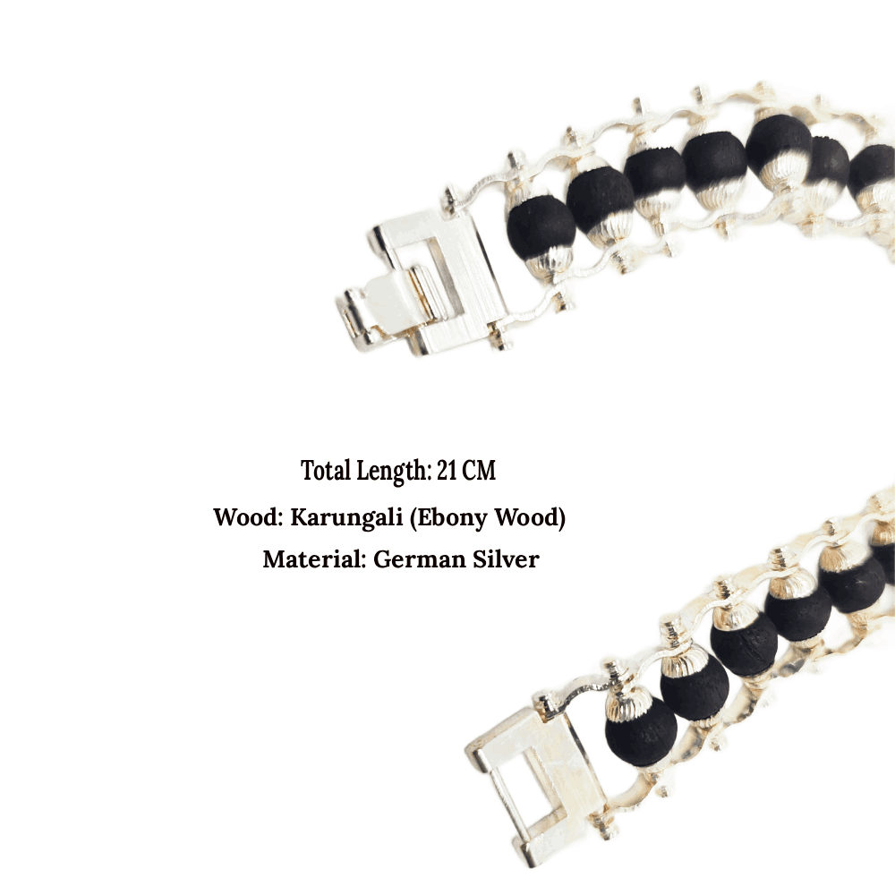 Karungali Wood German Silver Bracelet features 8mm authentic ebony (Karungali) wood beads linked with German silver caps or spacers, creating a durable, elegant wrist accessory. Karungali, revered in South Indian spiritual traditions, naturally absorbs negative energies and provides grounding protection.